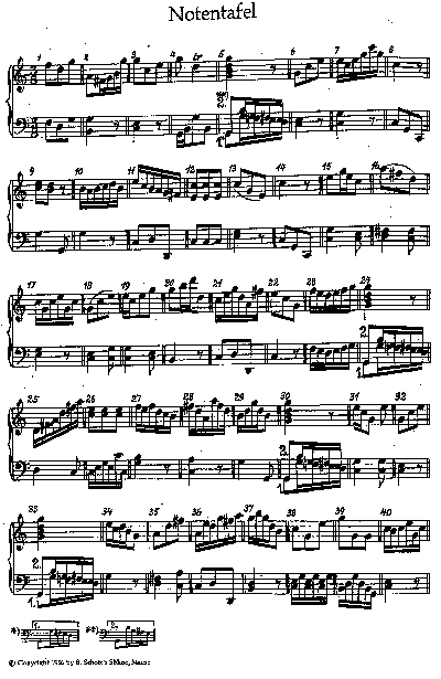 3. das Spiel beginnt. Ergibt der erste Wurf z.B. eine 10, sucht man in der Kolonne I neben der Zahl 10 die Nummer des Taktteiles; in unserem fall also 98. Nun wirft man für den zweiten Takt; erzielt man z.B. ein 6, so findet man in der Kolonne II den Taktteil 74 usf. der achte Takt gilt gleichzeitig für die Wiederholung: man schreibt zunächst unter [1. ] die unter 1 und bei der Wiederholung [2. ] die unter 2 angegebenen Noten auf. Dann erwürfelt man in gleicher Weise die Taktteile des zweiten Walzerteiles. Will man einen längeren Walzer haben, fängt man noch einmal von vorn an.