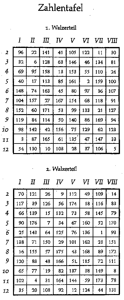 Nach diesen beiden Zahlentafeln werden die Takte - entsprechend der gewürfelten Zahl - herausgesucht.