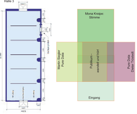 Es scheint ein Geheimnis in der Naturkonstanten e zu liegen, denn sie erzeugt die Dreivierteltöne der morgenländischen Musik und ist die wichtigste mathematische Größe in den Naturwissenschaften. Im Kulturzentrum Einstein, München, installieren wir einen immateriellen Klangdom mit zwei asynchron laufenden Rechnern (Laptops mit Pure Data) gespielt von Martin Siegler und Dieter Trüstedt. Dazu kommt die lesende Stimme von Mona Kreipe mit Texten von John Cage. Die Naturkonstante e bestimmt die Klangarchitektur - hier die Tonhöhen und die Zeiten. Ulrike Trüstedt inszeniert in Halle 4 die Hörübung „deep listening“, Pauline Oliveros.