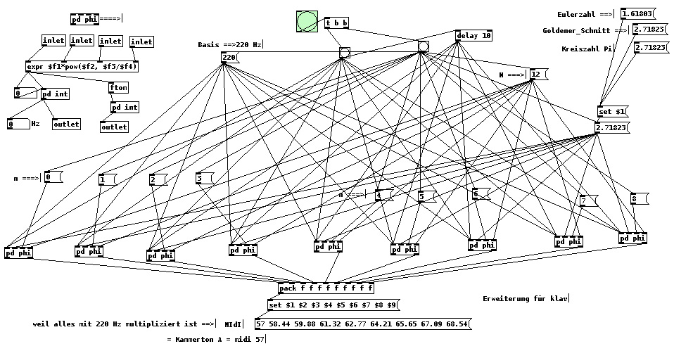 Die Schaltung oben links in der Grafik zeigt das Innere des Objektes [pd phi]. Diese Schaltung berechnit fn = fo*[e hoch n/12] aus der Basisfrequenz fo =220 Hz,