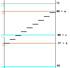 Dieser Midi-Monitor zeigt die 9 Tonstufen der 3/4-Ton-Skala zwischen A = 57 Midi und 68.54 Midi, d.h. fast 69 = a = Kammerton 220 Hz.