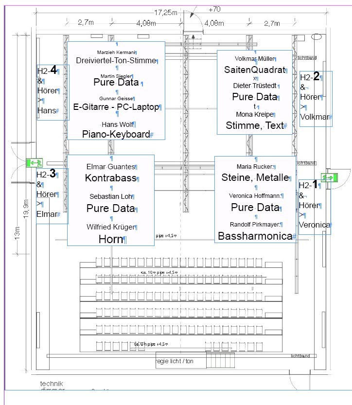 Die akustischen Instrumente bzw. die Spieler*innen reagieren auf diese Folgen frei und auch kontrapunktisch. Es entstehen Klangbildmuster, die wie Folien, von den Pure-Data-Spieler*innen ausgelegt sind für: Horn, die beiden Stimmen, Piano-Keyboard, Steine und Metalle, das SaitenQuadrat mit Elektronik, Bassharmonika, Kontrabass, Laptop-Gitarre.